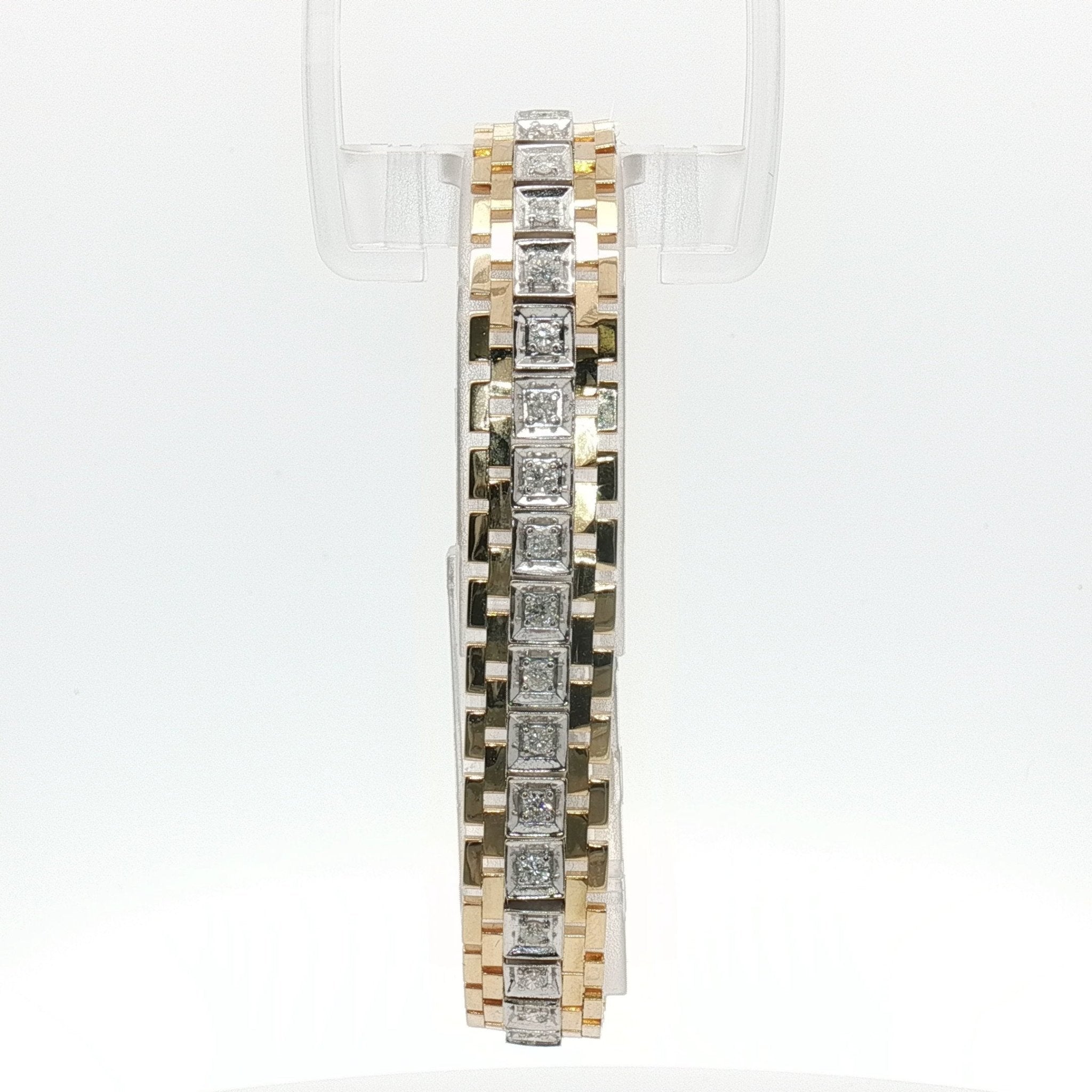 This striking diamond link bracelet is a timeless expression of luxury, crafted in rich 14K two-tone gold with an elegant balance of warmth and brilliance. Featuring a sleek geometric link design accented by sparkling round diamonds, this piece offers refined sophistication with a bold, modern edge. The photos highlight the bracelet’s substantial presence, polished finish, and radiant diamond detailing—perfect for elevating both everyday wear and special occasions.