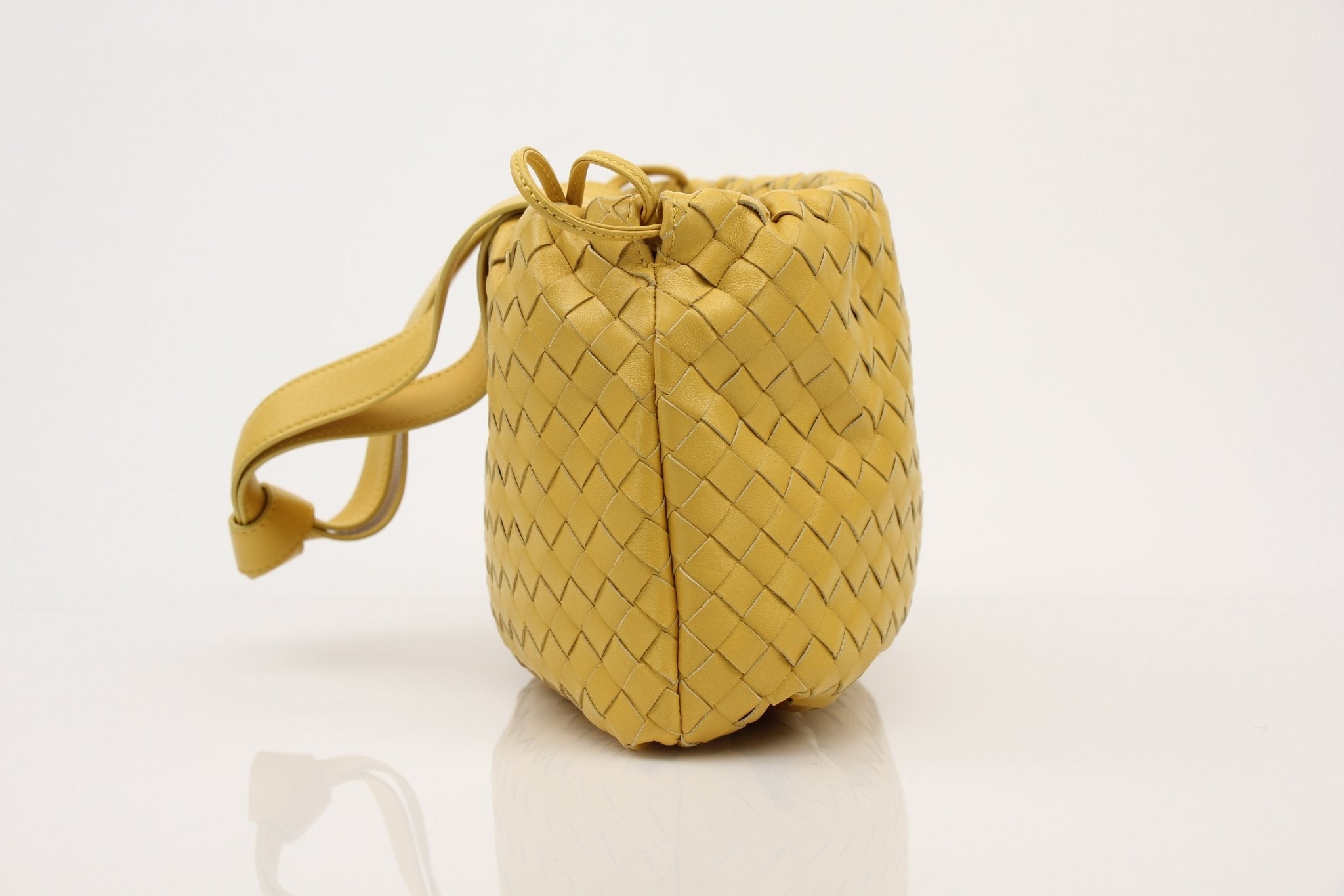 Crafted in buttery yellow leather, this Bottega Veneta Small Bulb Shoulder Bag showcases the house’s iconic intrecciato craftsmanship in a soft, sculptural silhouette. Its relaxed shape and elegant woven texture create a refined everyday statement, balancing luxury with understated ease. Finished with a roomy interior and comfortable shoulder carry, it is a timeless Bottega essential.