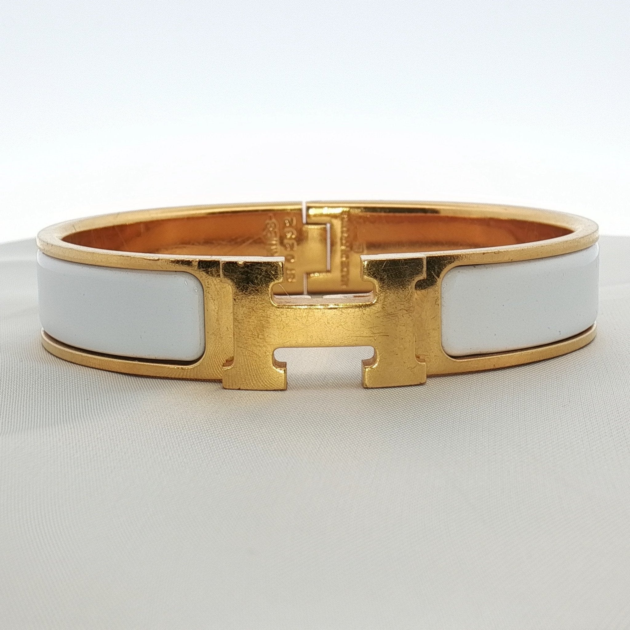 A timeless icon of French luxury, the Hermès Clic H bracelet is celebrated for its clean lines and unmistakable design. Crafted with smooth white enamel framed by polished gold-tone hardware, this bracelet delivers refined elegance with a bold signature finish. Designed to transition effortlessly from day to evening, it remains a coveted staple for collectors and style connoisseurs alike.