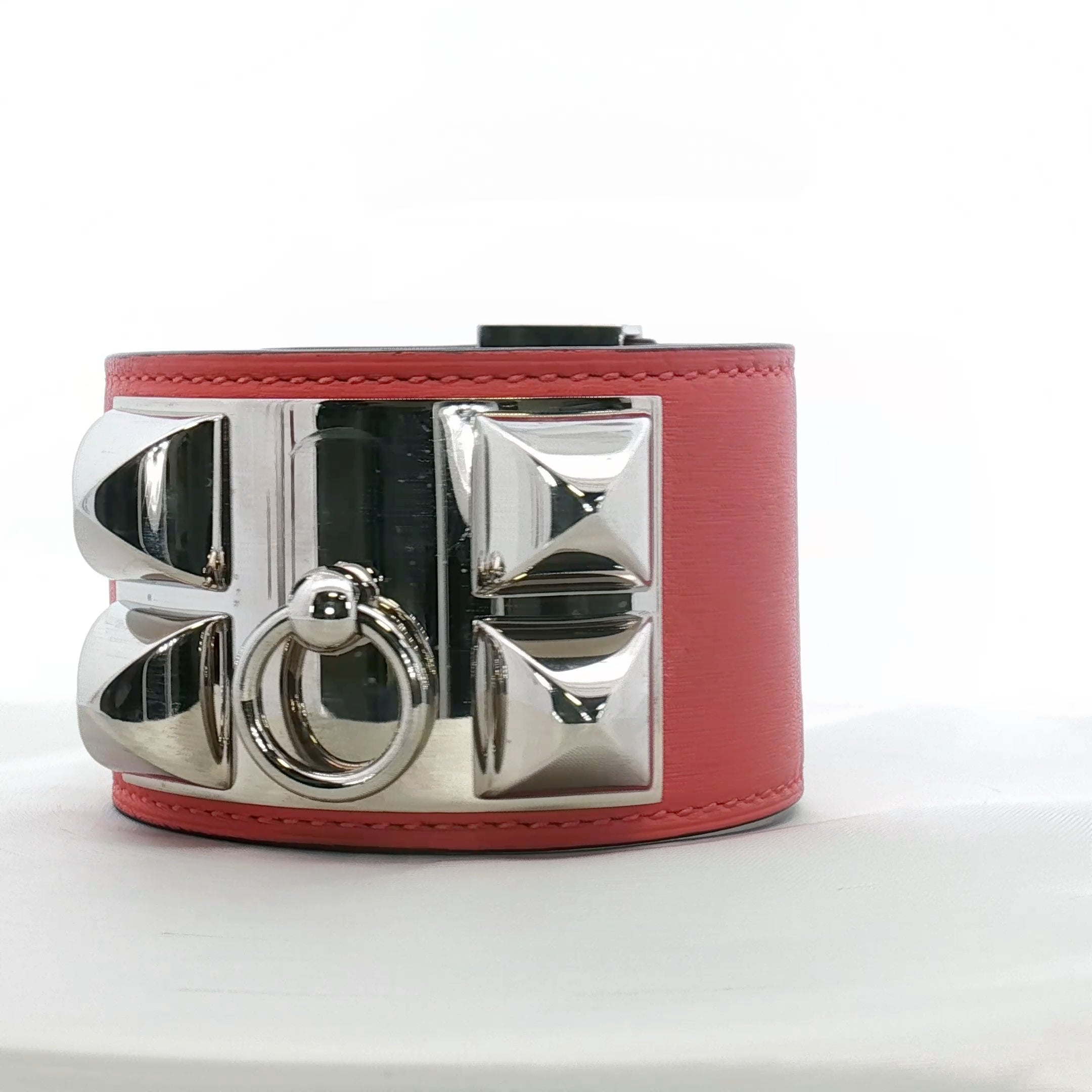 An iconic expression of Hermès craftsmanship, the Collier de Chien bracelet is defined by its bold silhouette and instantly recognizable stud-and-ring hardware. Crafted in rich red leather and finished with polished palladium-plated metal, this statement piece reflects the House’s heritage of equestrian influence and refined luxury, offering a powerful yet timeless accessory for any collection.