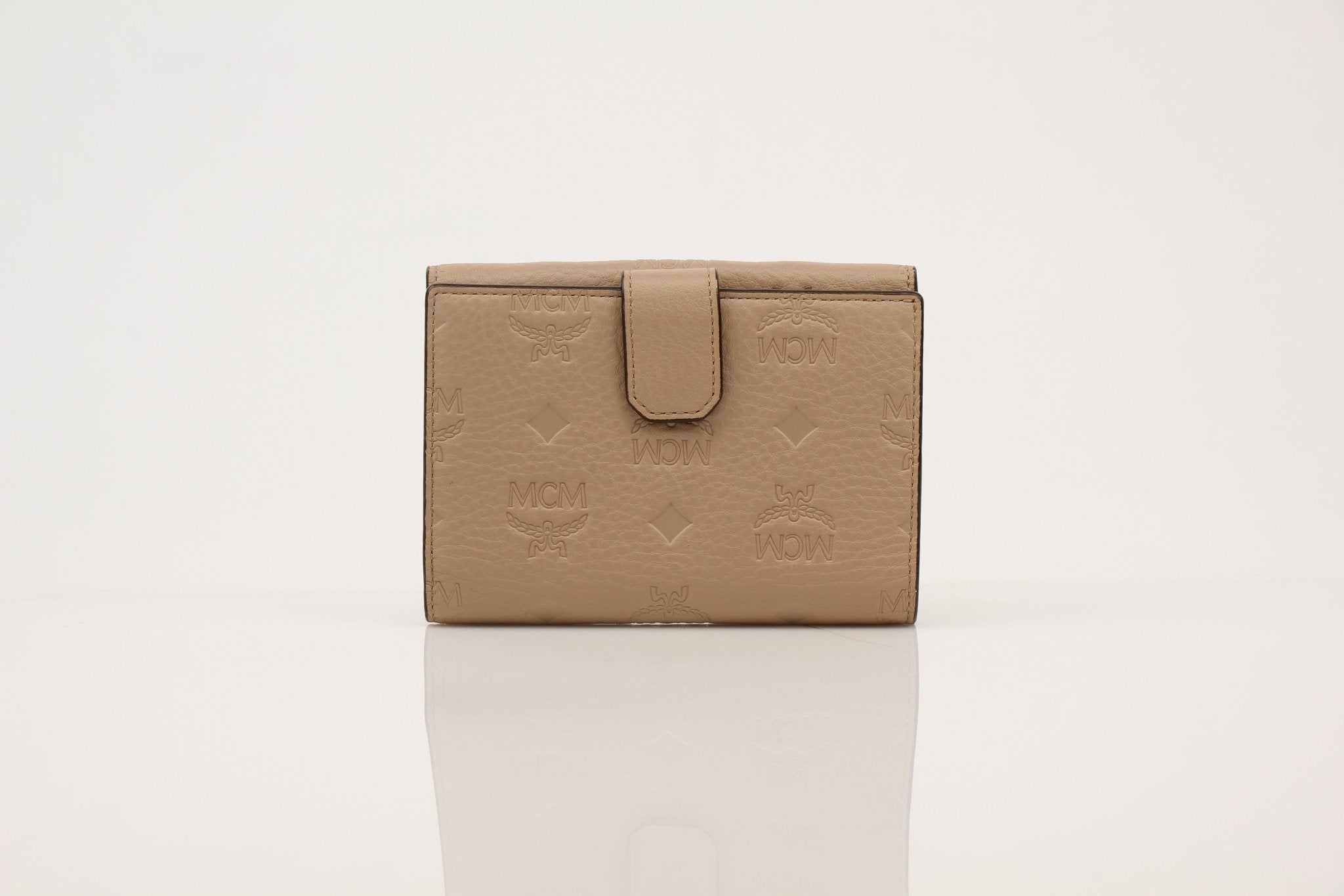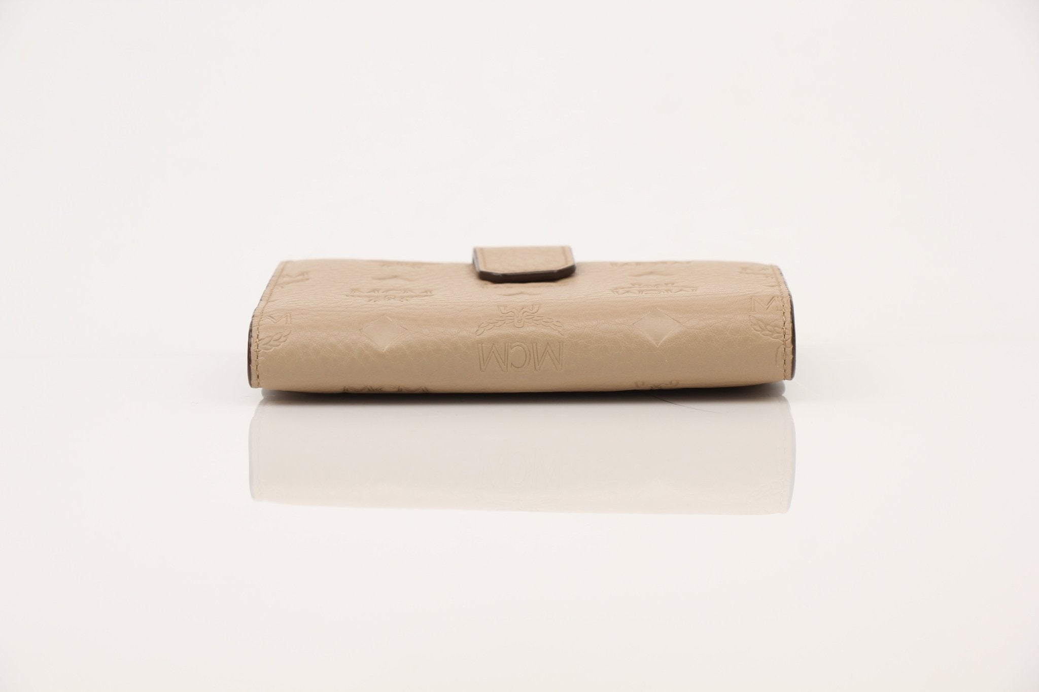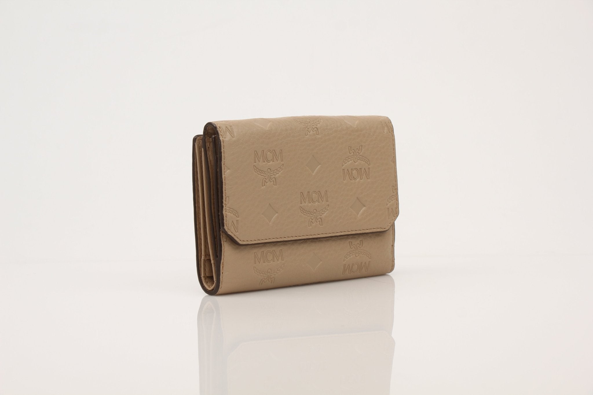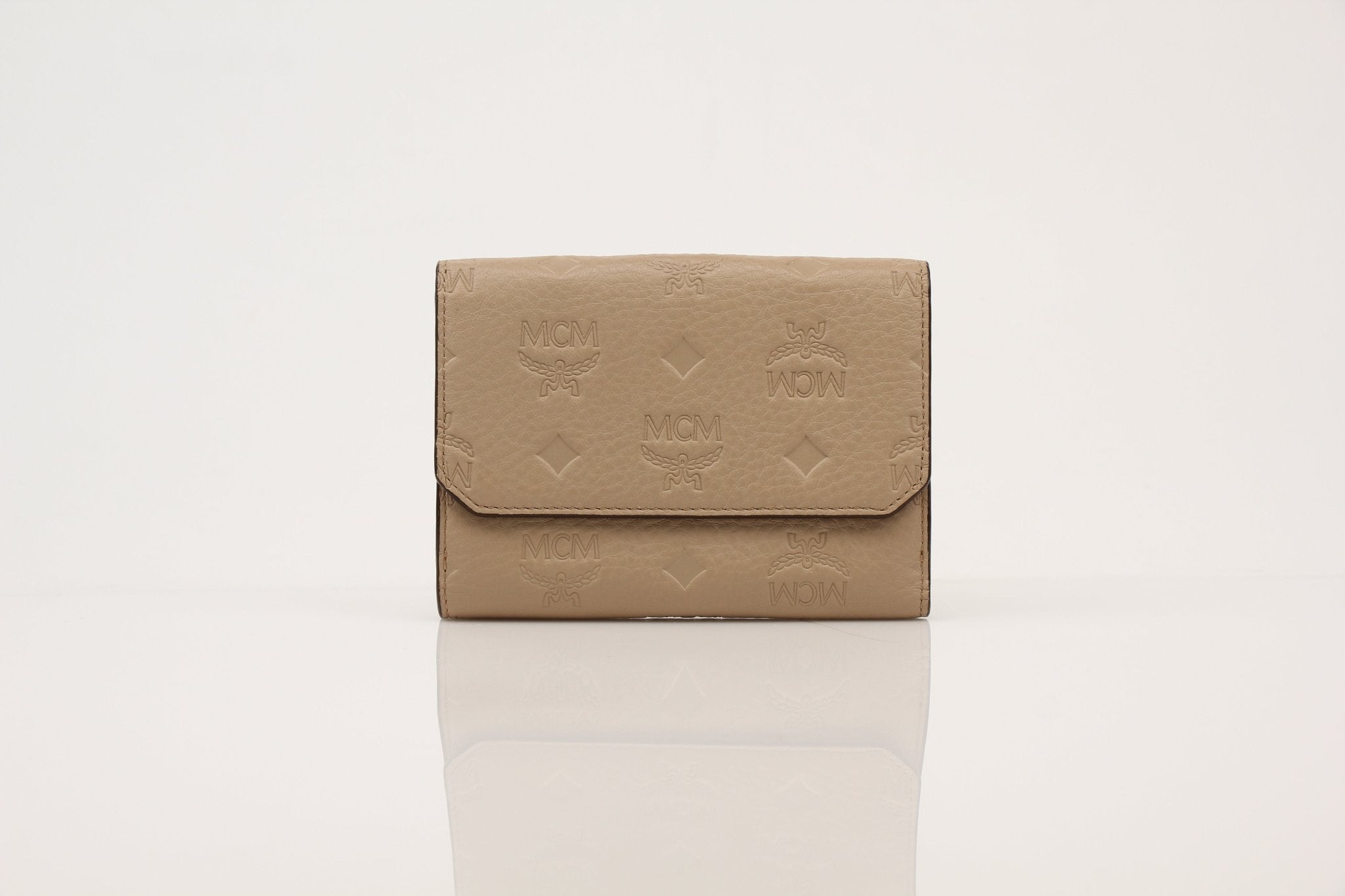 Crafted in soft, embossed leather, this MCM trifold wallet delivers refined everyday luxury in a compact silhouette. The iconic Visetos pattern subtly elevates the minimalist beige tone, while the structured design opens to practical compartments that keep essentials organized with ease. A polished, modern accessory for those who appreciate understated elegance.