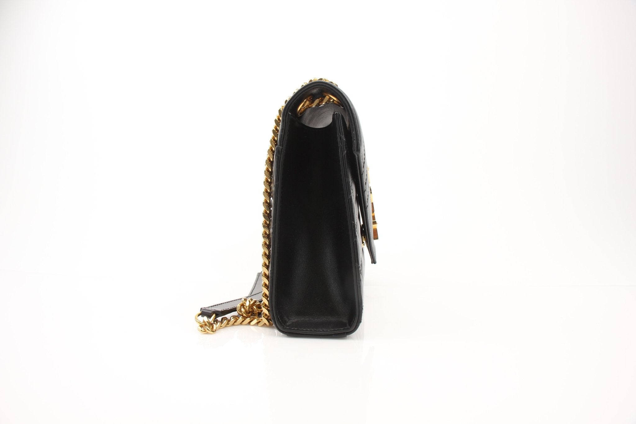 An icon of modern Parisian elegance, this Saint Laurent Envelope Triquilt Medium Shoulder Bag is crafted in smooth black leather with the house’s signature mixed matelassé quilting—chevron on the flap and diamond quilting throughout the body. The bold gold-tone YSL monogram and substantial chain strap create a striking contrast against the refined silhouette, making it equally suited for day sophistication or evening glamour. The structured envelope flap opens to a sleek, well-organized interior, and this piece includes its original dust bag. Our detailed photography captures the leather texture, hardware brilliance, and overall structure so you can purchase with complete confidence. As always, Gold & Beyond includes complimentary shipping, handling, and insurance with every order.