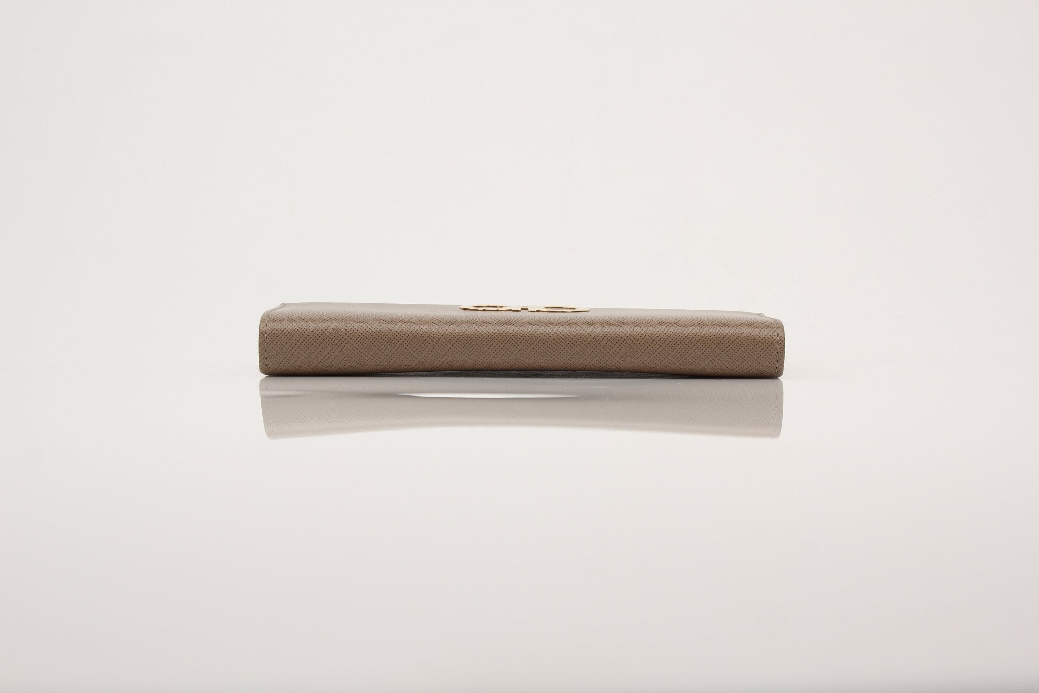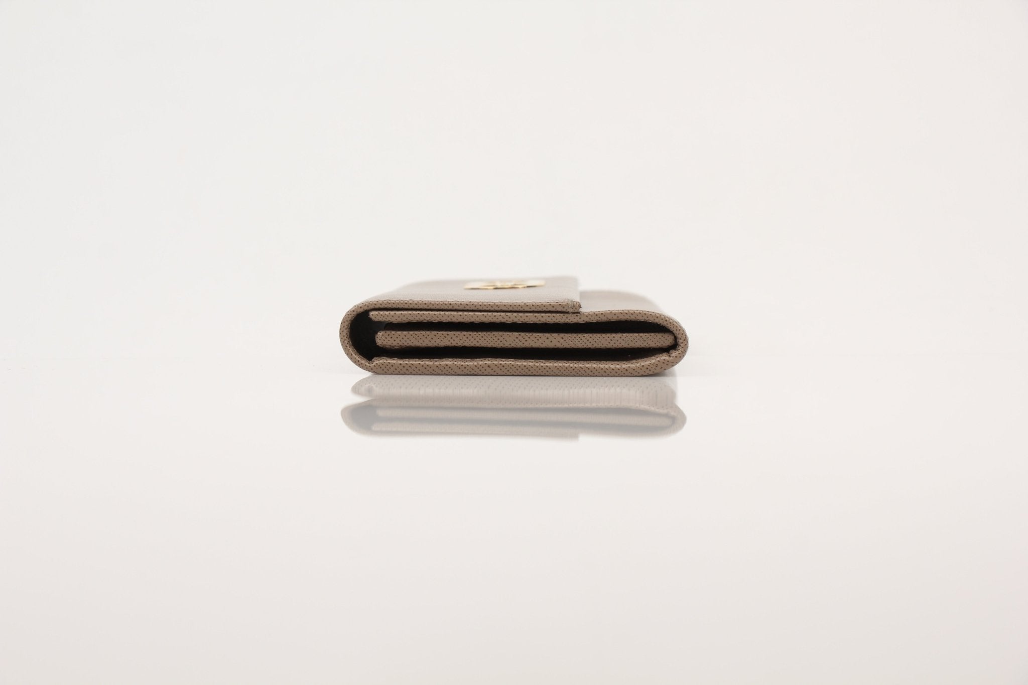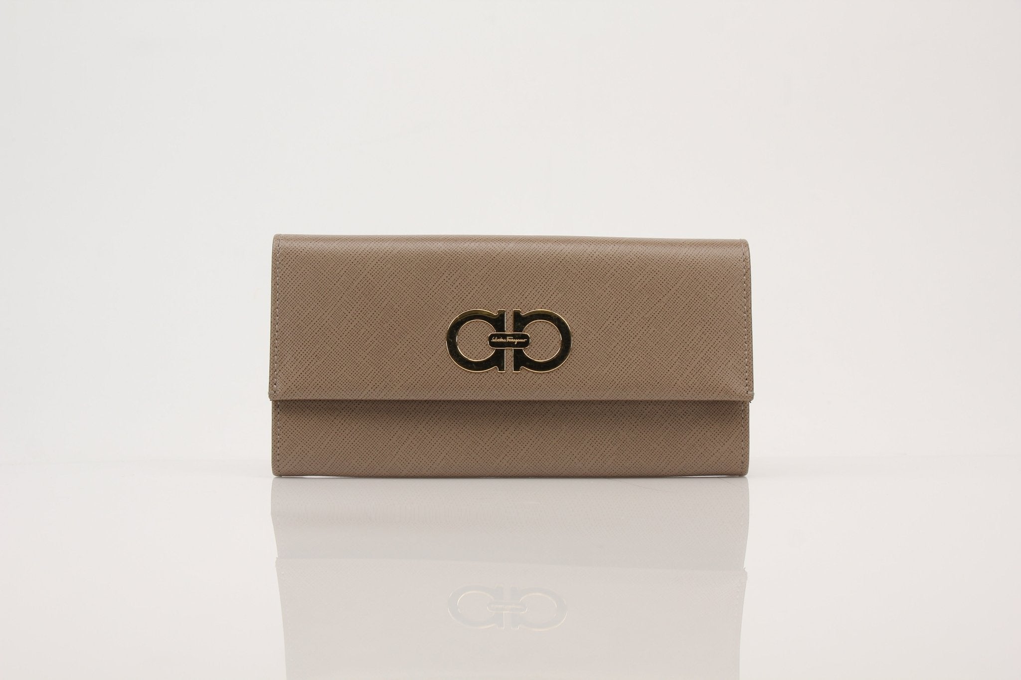Refined and timeless, this Salvatore Ferragamo continental wallet is crafted in structured taupe leather and finished with the house’s signature gold Gancini emblem. Its sleek silhouette opens to a thoughtfully designed interior, offering an elegant balance of style and everyday functionality. A sophisticated essential for those who value classic luxury in a modern, streamlined form.