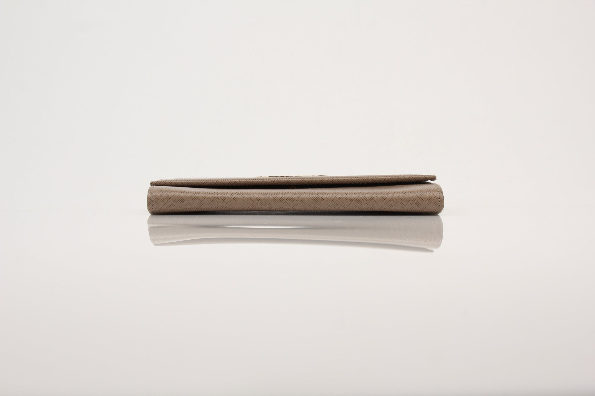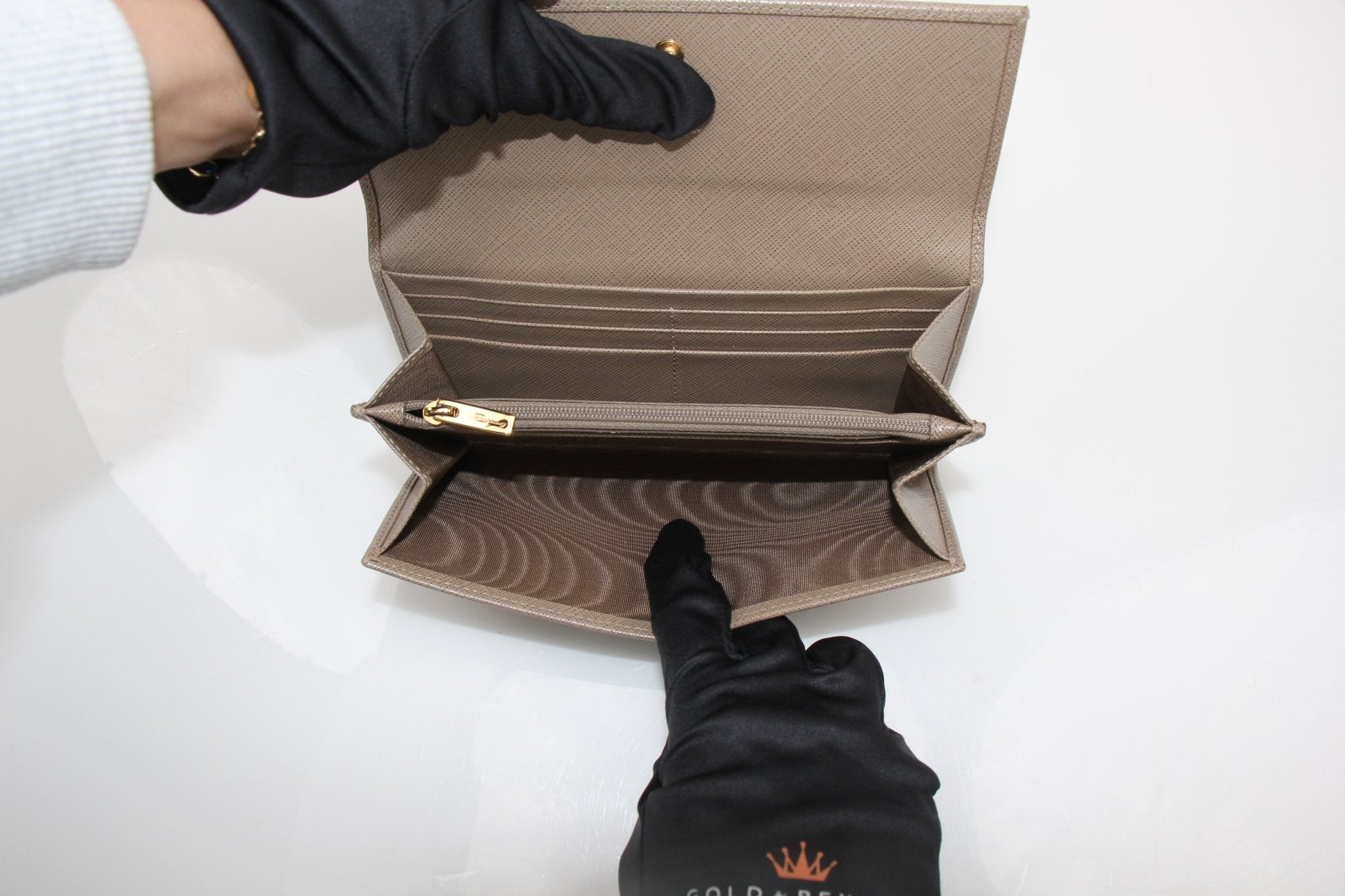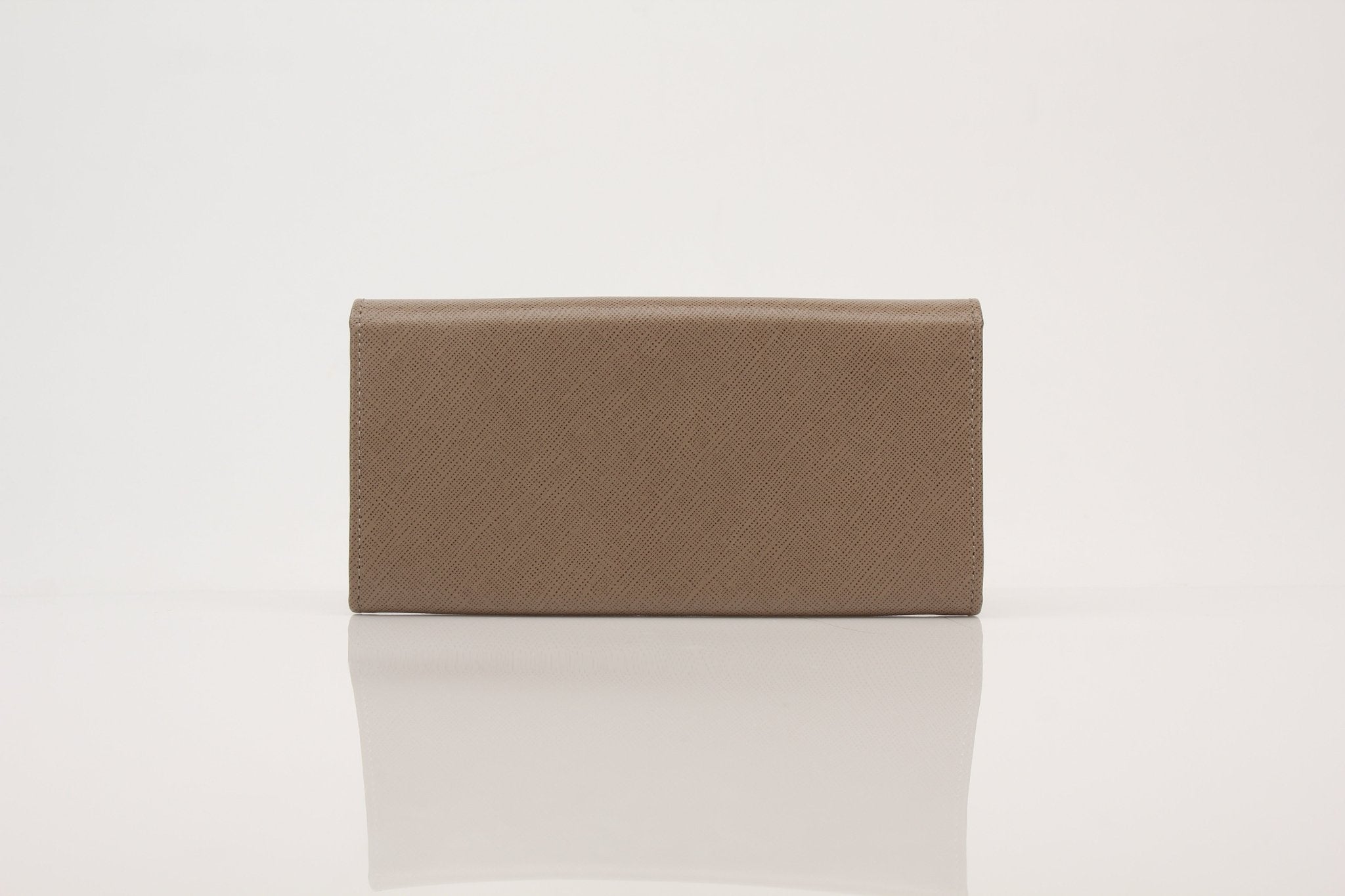 Refined and timeless, this Salvatore Ferragamo continental wallet is crafted in structured taupe leather and finished with the house’s signature gold Gancini emblem. Its sleek silhouette opens to a thoughtfully designed interior, offering an elegant balance of style and everyday functionality. A sophisticated essential for those who value classic luxury in a modern, streamlined form.