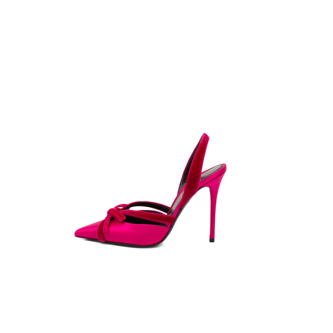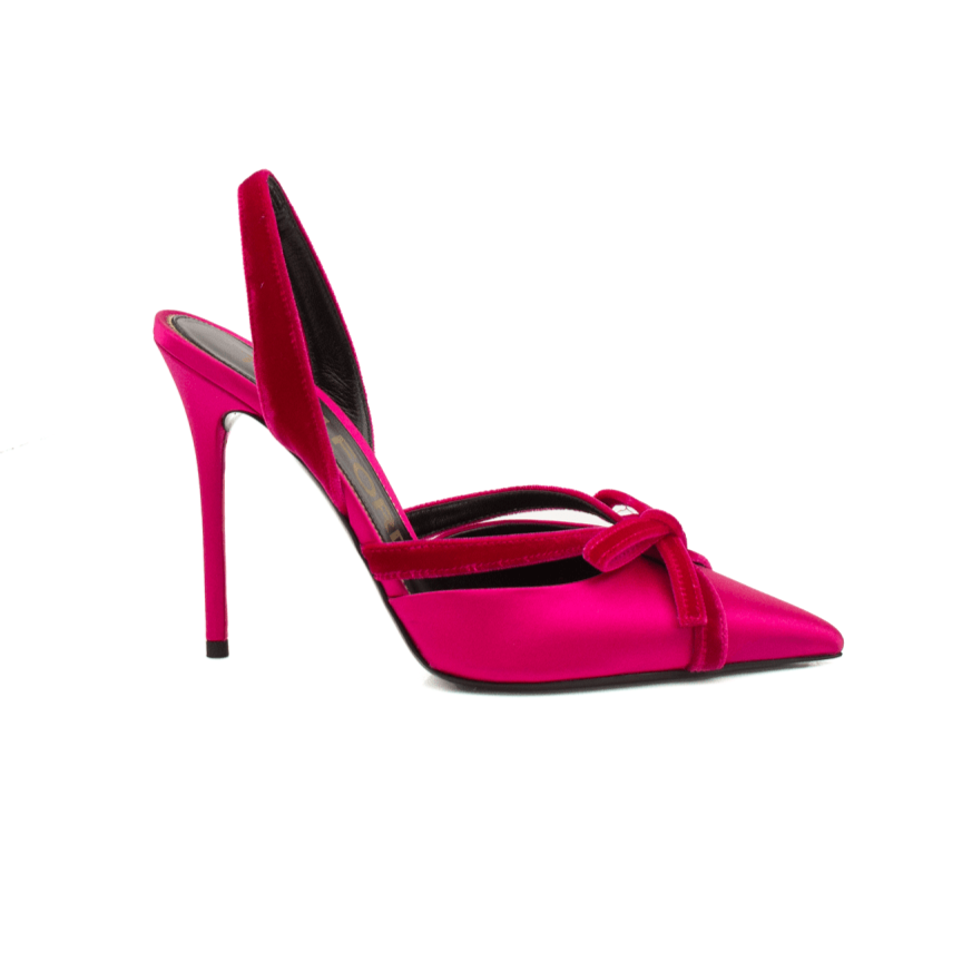 Bold and refined, these Tom Ford slingback heels deliver striking elegance with a modern, feminine silhouette. Crafted in vibrant fuchsia satin, the design features a sharply pointed toe accented by a delicate bow that adds a touch of playful sophistication. The slender stiletto heel and slingback strap create a graceful profile, making this pair a standout choice for evening styling and special occasions.